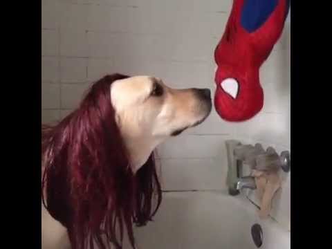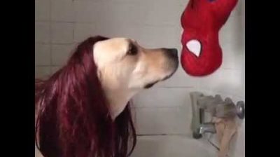 Pete el labrador amarillo recrea la famosa escena del beso bajo la lluvia entre Mary Jane Watson y Spider-Man de la película “Spider-Man” de 2002. Aunque es un poco irónico que Pete está desempeñando el papel de Mary Jane, se ve bastante guapo en una peluca roja.