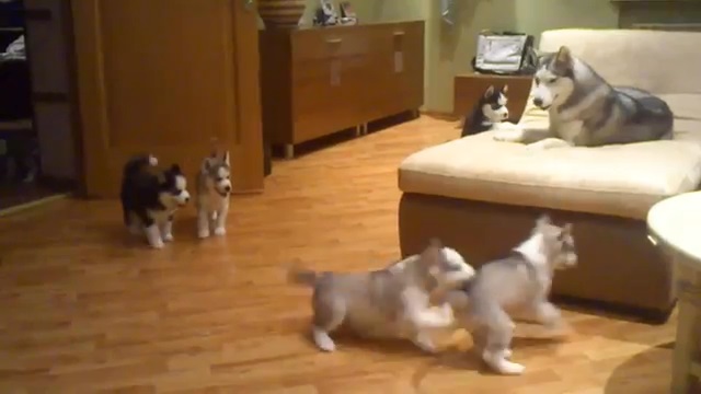 En una casa en Rusia, una madre ronca jugando con sus cachorros 7 corriendo y haciendo saltos sobre el sofá.