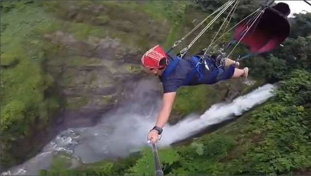 Un hombre captura la pista fantástica con la polea de cabeza, en las 7 cascadas del lago Sebou, en South Cotabato, Philippines.