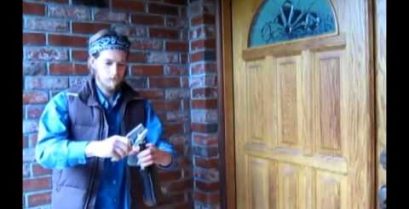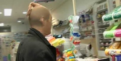 El Chris Taylor desde el programa de televisión 'la guerra de cazadores en todo', metidos en varios almacenes llevando sobre su cabeza una medias para mujer.