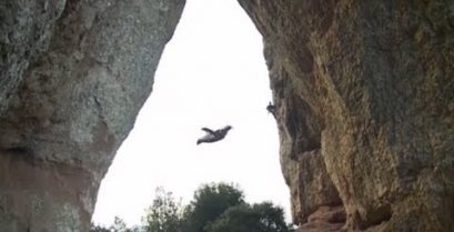El atleta Alexander Polli hace un vuelo arriesgado con wingsuit pasando por un paso estrecho a las montañas de Roca Foradada, España [...]