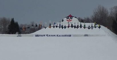 Una cadena humana de 30 esquiadores haciendo un impresionante salto Upside Down en Mont Saint-Sauveur, Canadá