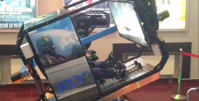 En un cine IMAX en Perm Rusia, Hay esta aeronave simulador para el videojuego 'Guerra Thunder'. El jugador tiene la sensación de vuelo como la cámara se movió y rotada, creando una simulación realista.