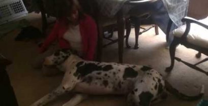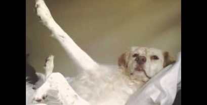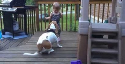 Zoe, un perro adoptado recientemente, jugar junto con su hombre amado, la pequeña Charlotte.