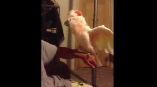 El loro llamado guijarro, diabólicamente reír y sacudir la cabeza frenéticamente en todas direcciones mientras se sienta en la mano de su propietario.