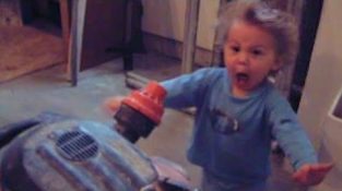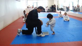 Un adorable niño tratando de romper una tabla, como parte de un espectáculo de taekwondo en Peak Taekwondo School & Fitness Center en California. Aϊaaa!