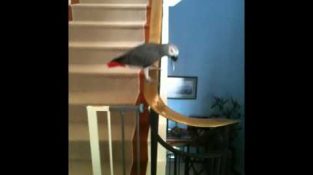 El Stanley, un loro gris, Ha aprendido a bajar las escaleras de la casa deslizante sobre el pasamanos.