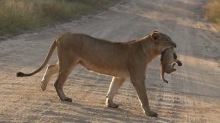 Una Leona atrapa la luz para cruzar la carretera, tal como lo ve un coche que. Una linda escena en el Parque Nacional Kruger, en África del sur.