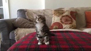En una cama, El gatito Winnie mueve la cabeza al ritmo de la canción 'Uptown Funk' de Mark Ronson..