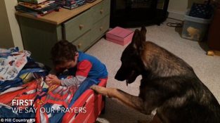El Mparon, un pastor alemán, preparándose para la cama con buen amigo, el pequeño Xander.