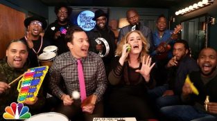 La cantante Adele acompañada por el presentador Jimmy Fallon y la banda 'The Roots', interpretar el tema 'Hola' en vivo con instrumentos musicales escolares.