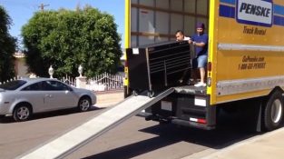 Dos portadores en Pennsylvania, Estados Unidos, intente descargar de su carro una caja de herramientas completa muy pesado.