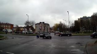 La synepibatis de un coche en la ciudad de Cherepovets, Rusia, dejar el vehículo y cae en la carretera cuando el conductor hizo una fuerte inversión. Se escapó por poco dinero...