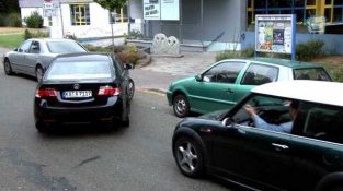 Una mujer le cuesta hacer las maniobras necesarias para aparcar su coche. Afortunadamente, Hay una guía útil para ayudar a.