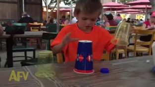 Un niño pequeño haciendo que su hermana de adivinar en cuál de las tres tazas es oculta una tapa de plástico. La chica siempre encuentra una solución, pero el pequeño no parece entender por qué.