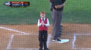 En domingo 22 noviembre, el año 2015, el ithan, un niño de 7 años, frente a un vergonzoso hipo como canta el himno nacional de Australia, antes de un partido de béisbol entre Brisbane y Adelaide mordedura. [...]