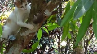 Un ratón acechado por dos gatos silvestres. Me las arreglé para escapar de ellos; La ansiedad es intensa!