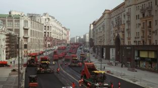 Un ejército de unos 300 vehículos reconstruir el asfalto en la calle Tverskaya y la plaza Pushkin de Moscú, Rusia. Dentro de un día aproximadamente 8 chapado.000 toneladas de asfalto en un área 32.000 metros cuadrados.