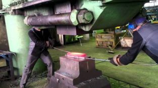 Trabajador de la fábrica de acero forma un pedazo de metal, usando un martillo moderno de 3 toneladas.
