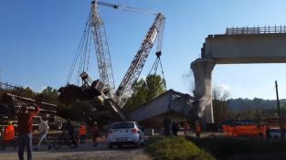 La espectacular caída de una grúa en la construcción de un puente de ferrocarril cerca de Varese, Italia. La grúa coloca una porción del puente cuando volcado, afortunadamente sin causar daños.