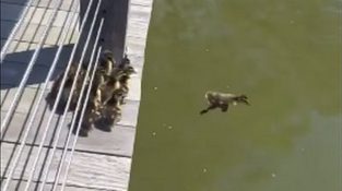 Una familia de patos sumergirse en el agua de un lago por una cubierta de madera. Madre salta primero y espera a los patitos, uno de buceo después de la otra con más o menos vacilación.