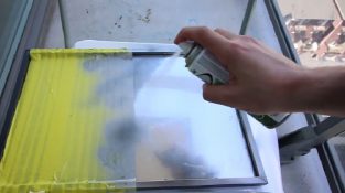 El efecto espejo de la empresa spray aerosol Rust-Oleum en la parte de atrás de un vidrio y crea un espejo regular.