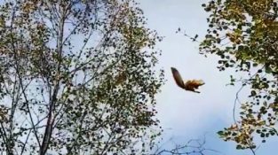 Una ardilla salta de árbol en árbol