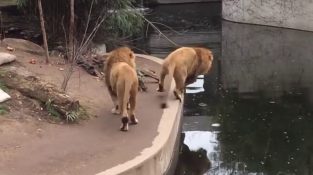 león incómoda cae en el agua