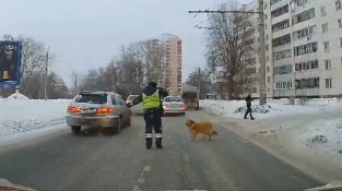 En la ciudad de Chelyabinsk en Rusia, un agente de tránsito del tráfico parando ver a un perro herido esperando para cruzar la calle.