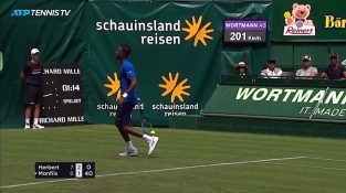 Lunes, 17 de junio 2019, tenista francés Gael Monfils hizo una espectacular golpear ciegamente, conseguir el punto por su compatriota Pierre-Hugues Herbert.
