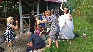 invitados intoxicados y parientes entran en las manos de la final de una ceremonia de boda en algún lugar de Rusia.