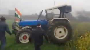 Un agricultor que conducía una manifestación en India no salió como se esperaba, después de que el tractor volcara, su conductor cayó al suelo, y el tractor tomó un rumbo loco por su cuenta.