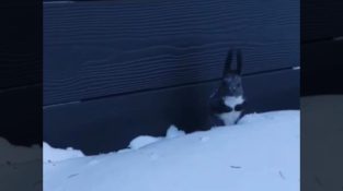 Una ardilla que puede moverse rápido en la nieve., cavando debajo de su superficie.