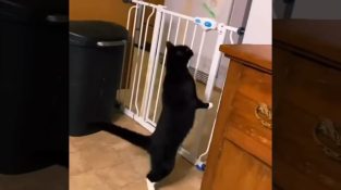 Un gato se resiste a saltar un obstáculo para mascotas, pero finalmente descubre que puede superarlo mucho más fácilmente.