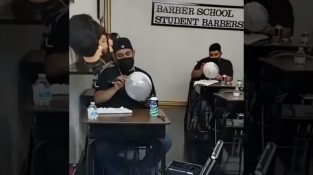 Estos barberos están capacitados para afeitarse con el bisel., en globos cubiertos con espuma de afeitar.