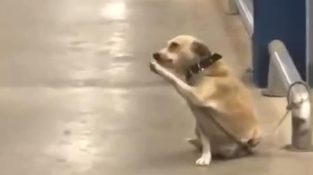 Fuera de un supermercado, un perro amarrado por su dueño saluda a los que salen de la tienda.