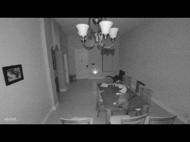 Keskellä yötä, kissa pöydällä kaatamalla runko hänen jalka. Kehyksen putoaa lattialle ja lasinsiruja. Tapaus olisi voinut estää siellä, mutta talo on varustettu hälytys, joka havaitsee äänen lasinsiruja. Hälytys aktivoituu, aiheuttaa tuhoa kahdessa muussa kissojen ja herää omistaja, joka kiirehtii sisäänkäynnin käytöstä. Mitä syyllisiä kissan, Hän seisahtui.