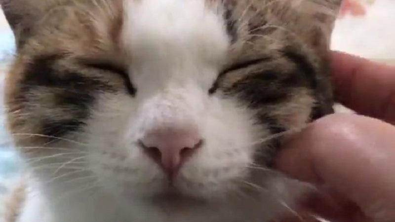 Nainen hyväillen kissa pää. Mutta yhtäkkiä, kissa romahtaa sängylle, kuten hypnoosissa. Luultavasti loppui akku.