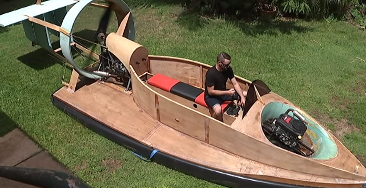 Pilotti James Greenbergerin täyttänyt lapsuuden unelma, tehden itsensä ilmatyynyalus hänen autotalli suunnitelmat ostaa verkosta.