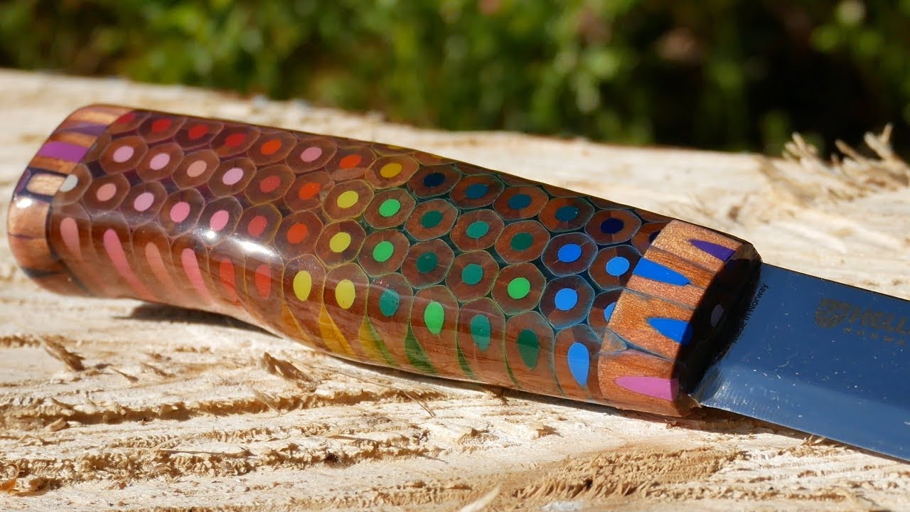 Käsityöläinen Ruotsista valmistaa kahva käyttämällä värikynät liimattu epoksihartsin.