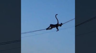 Intian kaupungeissa asuvat makakit ovat erittäin kekseliäitä ja ovat löytäneet tavan siirtyä korkeasta rakennuksesta helposti ja vaivattomasti. He hyppäävät kaapelin päälle, ja käytä sitä hihnapyöränä.