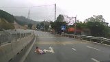 Vuoren tiellä Norjassa, Lapsi välttää kuorma -auton lyöntiä hetkeksi, kun sokeasti ohittaa ...
