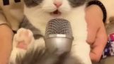 Kissa laulaa mikrofonissa.