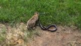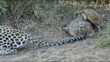Rohkea musta mäyrä kohtaa kolme leopardia, jotka hyökkäävät hänen kimppuunsa, Kansallispuisto Etelä-Afrikka Kruger.