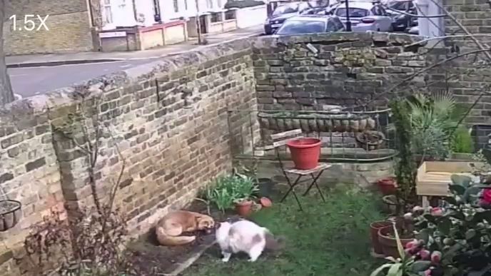Englannissa, kettu tulee puutarhaan hyppäämällä aidan yli. Mutta se vain putosi maahan, η Mindy, ragdoll-kissa, hän juoksi hänen kimppuunsa. Muutaman sekunnin kuluttua kaksikko kohtasi kasvotusten, kettu halusi lähteä.