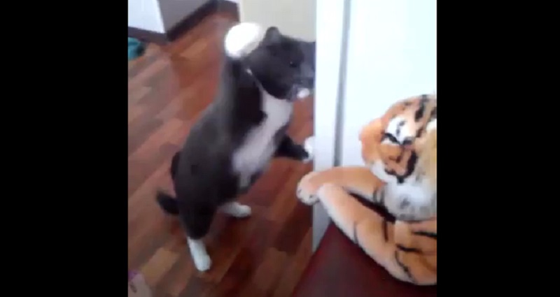 Kissa antaa väkivaltaisia iskuja loytrini Tiger makaa hiljaa toimisto.