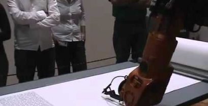 Teollisuusrobotti ohjelmoitu kirjoitettu Kalligrafinen merkkejä Raamatun tekstiä.