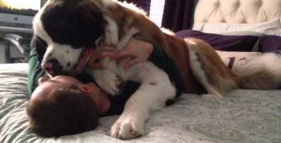 Sully Saint Bernard koira rakastaa isä! Katso kun hän tapit hänet ja antaa hänelle iso hali Palattuaan kotiin pitkän päivän työtä. Nyt se on ihana!