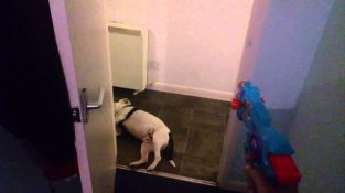 Koira Ziggy Trixx, 10 kuukauden ikäinen bullterrieri, kuollutta, kun pomo fake pistooli ampuu. Awesome lahjakkuutta.
