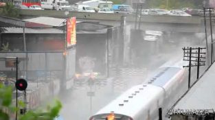 Moottoripyöräilijä kuuluu valtava lätäkkö